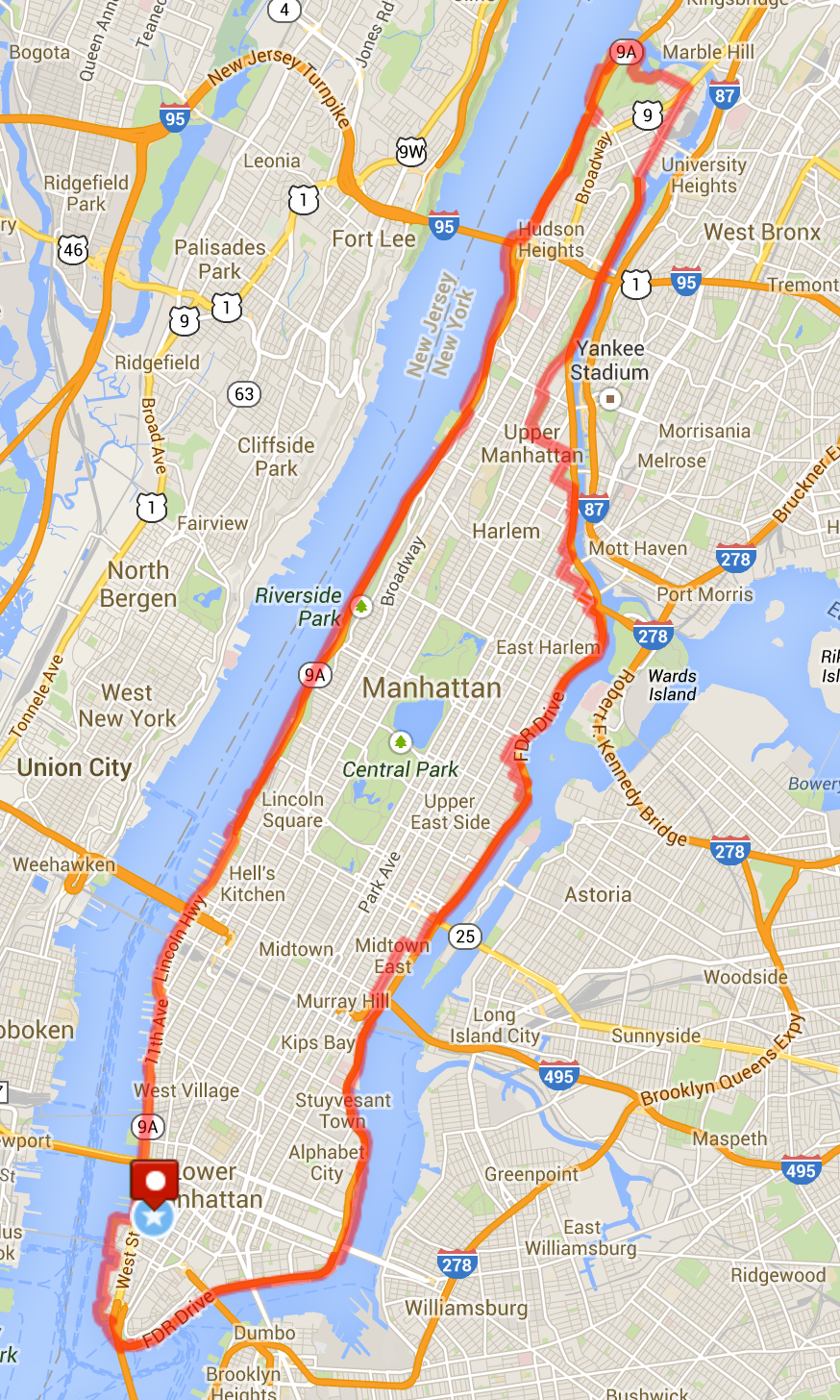 I’d run many of the paths around New York before, but there were some parts I thought would be tricky from a navigational perspective. I conveniently found this grassroots ultramarathon organized last year – the Madhattan – where 50 people ran the the same self-supported ultra I was attempting. I used their map as a template to help me prepare for the tricker-to-navigate areas, especially the north east part of the island, where the trail on the east side of the island ends.