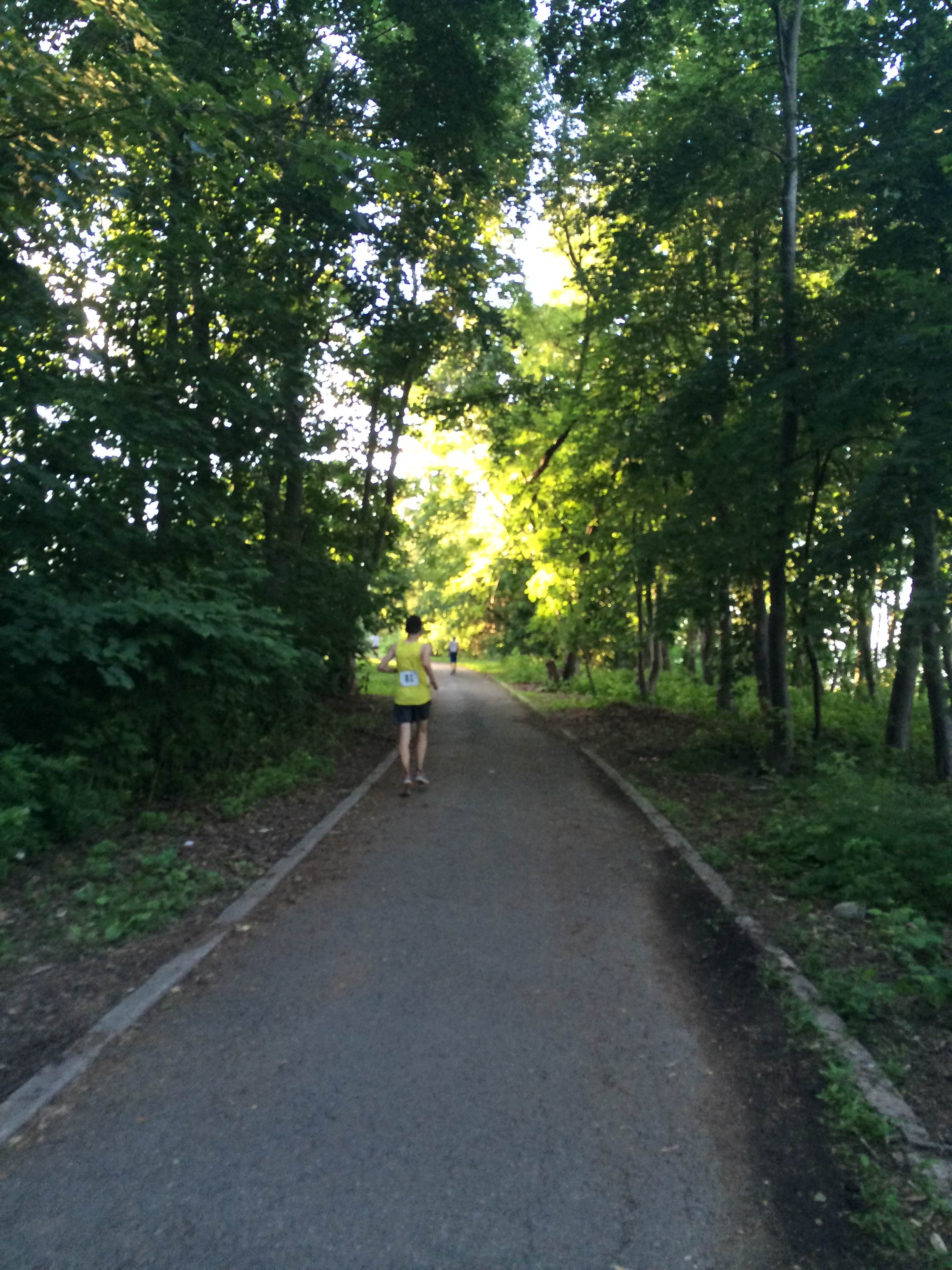 During the first loop, I followed the group to get an idea of what the course was like. I realized that I’d be seeing it many more times that day, but I’d only get one shot at seeing it for the first time. It was actually very pretty – it was a winding asphalt path through a grassy park, with many trees and ample shade. The park featured a couple of baseball mounds and tennis courts. Best of all, there was an actual bathroom along the course, which, as many runners know, is a true luxury when racing.