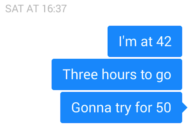 I was really struggling at this point. The idea of spending four more hours on the course to get to 50 miles seemed horrifying. I couldn’t even imagine it – it seemed like there could be no worse fate than needing to stay on my feet for another twenty miles.