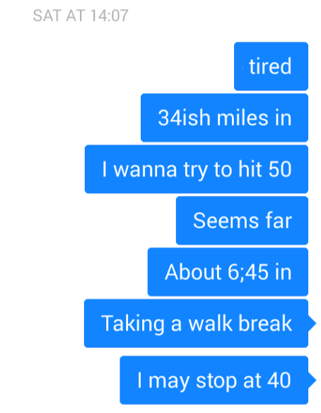 I have a personal rule for running – no texting, phone calls, etc during the run or race. I feel that we’re so connected and plugged in every other time of the day, and running should be a time to be separate from that. This race seemed different, however – since we weren’t venturing off into the wilderness, it seemed like we weren’t that far away from civilization. Since I had my phone anyway, and I was feeling so disheartened, I broke my cardinal no-texting-while-running rule and sent a few messages to Will.