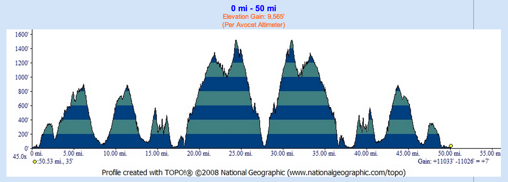 The out-and-back 50-mile course covered some familiar ground in the gorgeous hills just north of the Golden Gate Bridge. It also included quite a bit of climbing, with almost 10,000 feet of elevation gain over the 50 miles. Check out the course profile:
