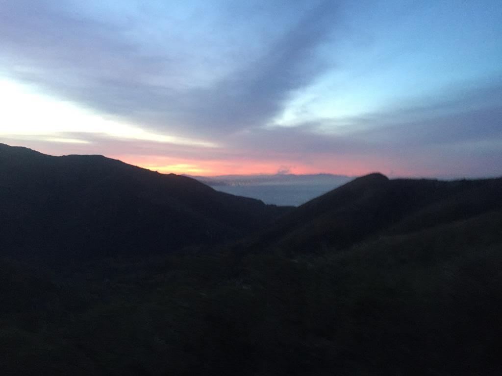 Running in the dark, before the sun came up. The trail here was pretty easy to navigate, in that it was wider fire roads and not extremely steep. That said, the rains earlier in the week had shaken a lot of debris off of the trees, so there were leaves, branches, and twigs dotting some of the downhill portions. My headlamp’s light was insufficiently bright for the task, so I trusted my night vision and the much more useful headlamps of my fellow runners.