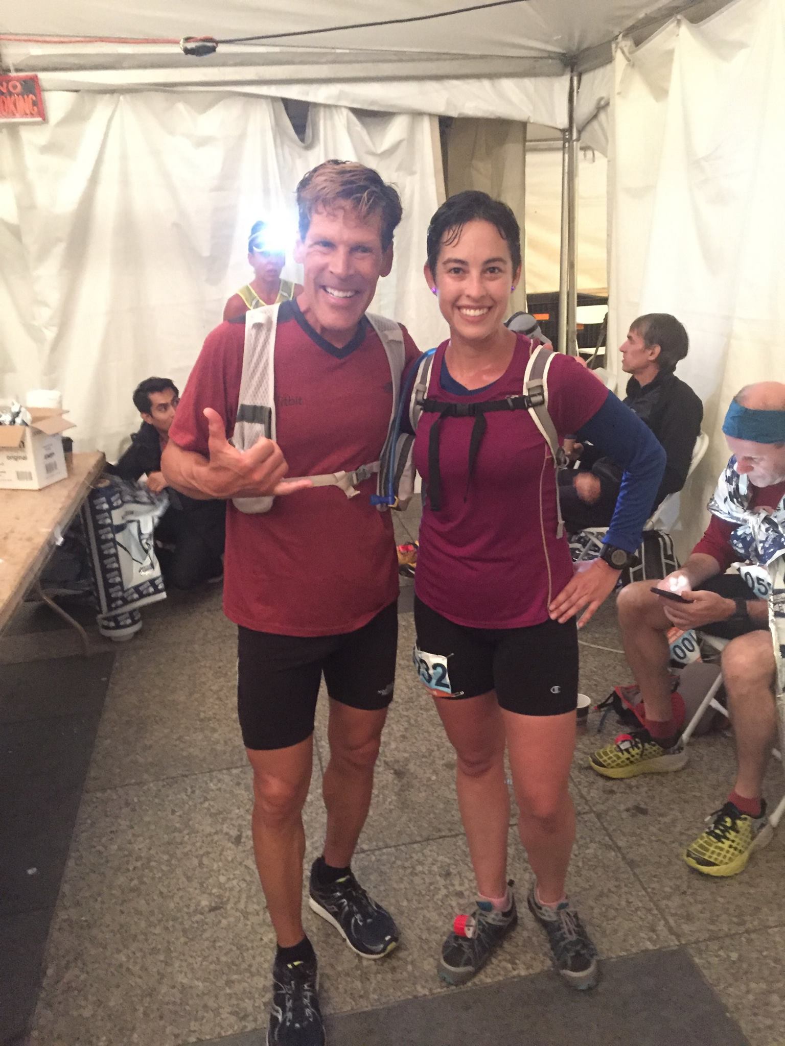 We weren’t allowed to start the second lap before the actual marathon started, so I hung out in the tent for quite some time. I was super cold – sweat was drying, and it was like 4:30am, so it was chilly outside. I layered on my winter parka and took a nap in between loops. Luxury!