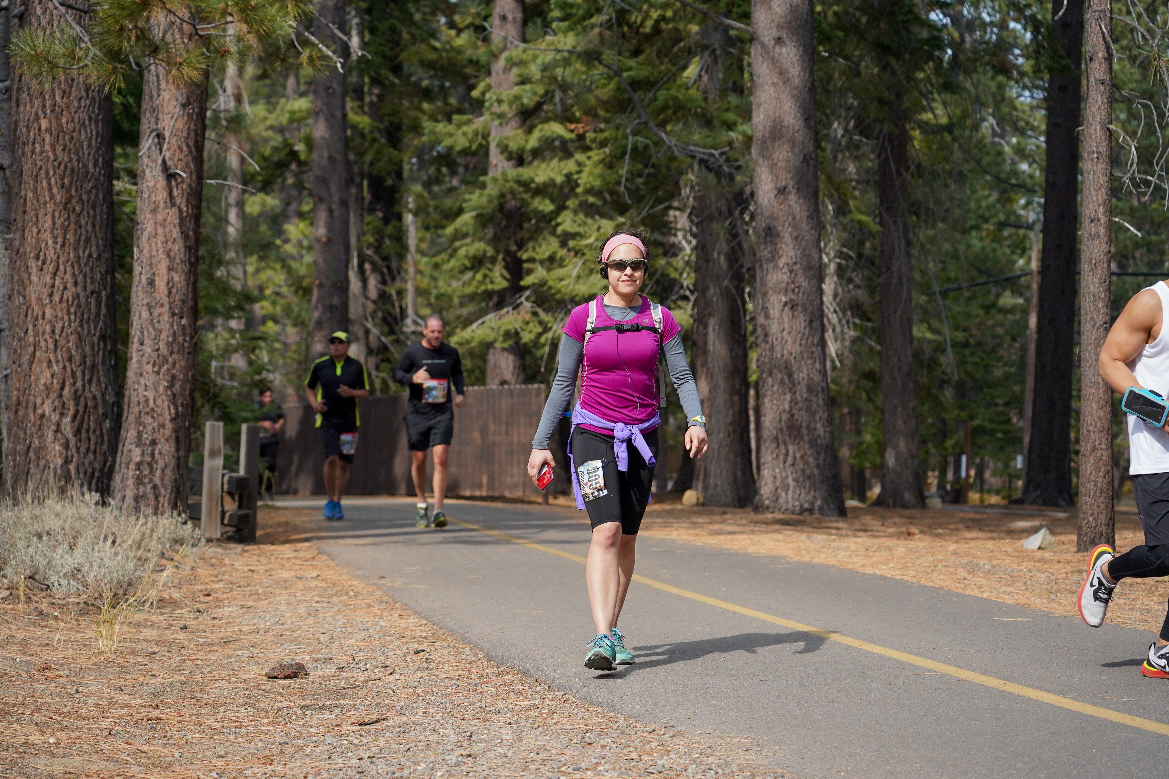 There was a long flat stretch right near the water fairly early on. The sun was coming up, and it was beautiful – purple reflections on a very still lake, with little round buoys in the water and pine trees framing the tiny ripples. This was easily the most beautiful part of the race.