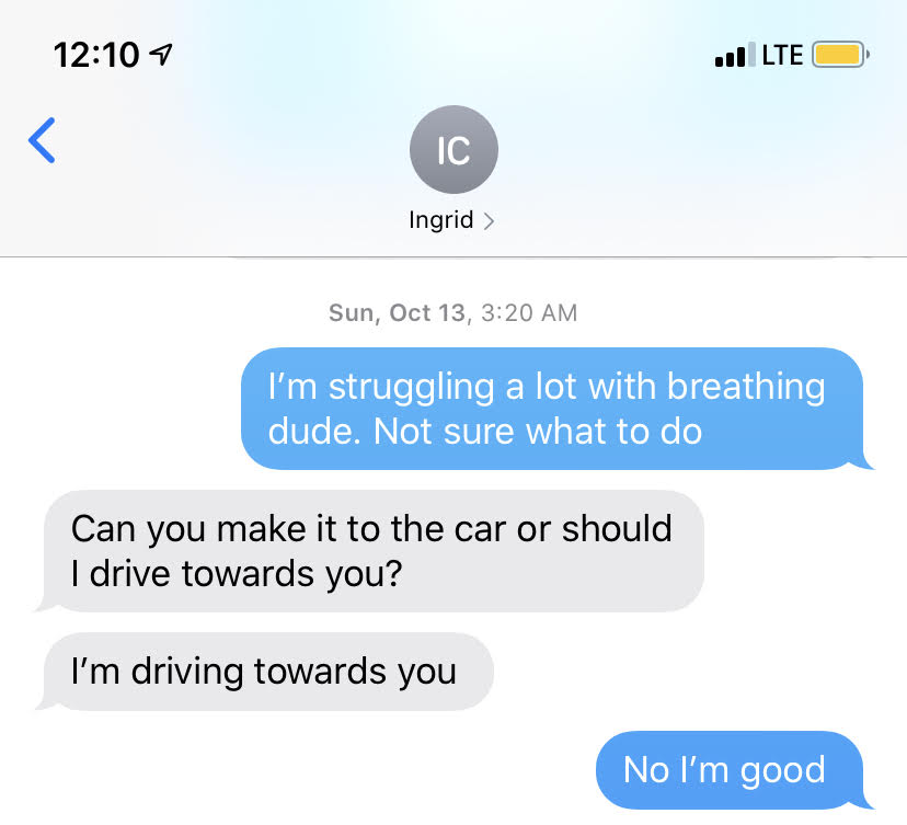 My breathing was getting progressively worse. I felt like I wasn’t able to take complete or deep breaths. I didn’t know what inhalers were really used for, but it definitely felt like I could have used an inhaler at this point.