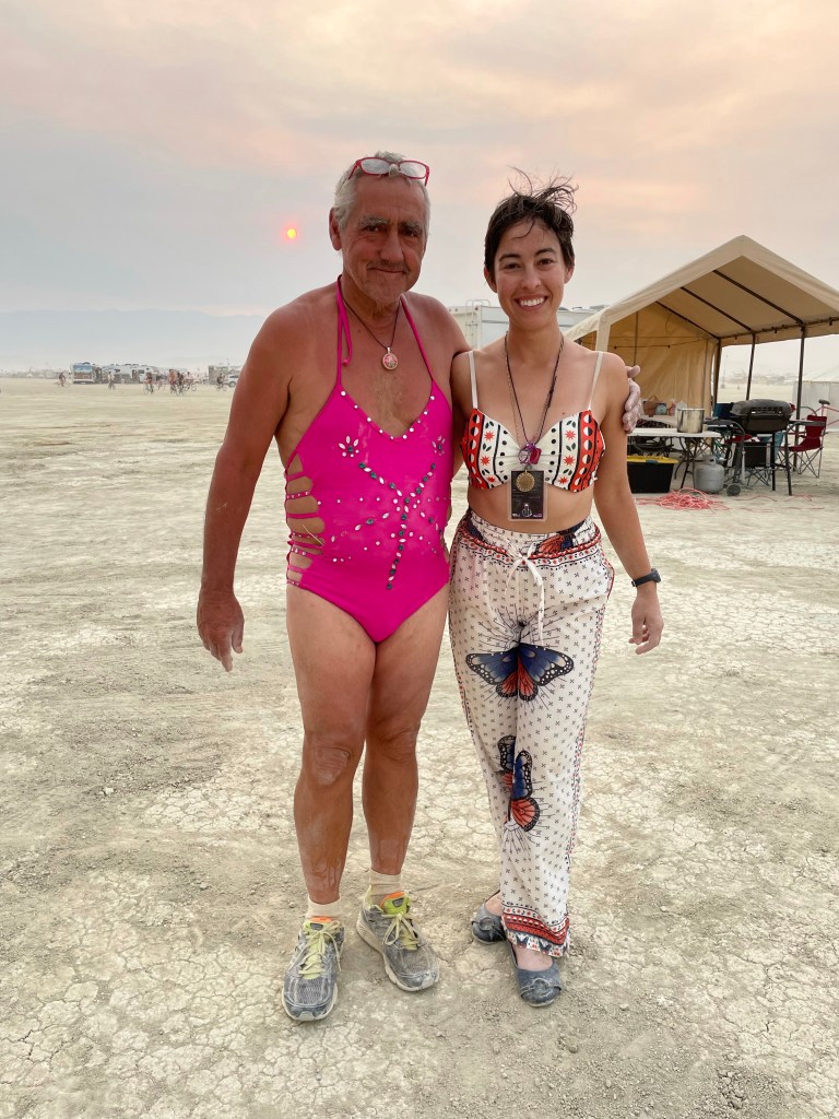 We did a slightly larger loop for the next one. On the way back in I had to use the bathroom – except, it’s the desert, and there are no bathrooms. Because this year’s Burning Man was completely unofficial and had no involvement from the Burning Man Org, the Bureau of Land Management put a number of rules in place that were somewhat inconvenient for campers. One of these rules made it very difficult for portopotties to be brought out to the Playa. Instead, I used the Wag Bag I had brought for this purpose, and paused in the middle of the desert to do this. This was probably one of the more scenic commodes I have had the pleasure of experiencing. Fortunately, the Wag Bags are EXTREMELY well sealed, so carrying it for the next ten minutes was not unhygienic or smelly, and I used hand sanitizer immediately after finishing the lap. I recognize this sounds and seems a little gross, but it was also very much a part of the Burning Man experience this year – most camps spent a weirdly large amount of time trying to figure out how to shuttle human waste off the Playa.