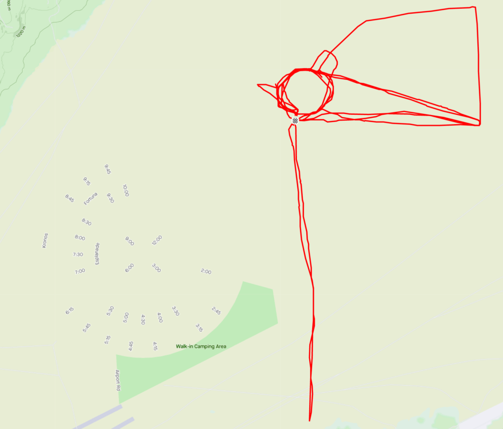 Because there was no official course this year, and no real landmarks to speak of other than loosely assembled clusters of RVs and tents, five of us stayed together for quite some time. A lot of our route was decided on the fly. We would reach some landmark – usually a collection of RVs – and someone would ask where we should go next. Then someone would suggest another landmark – likely another cluster of RVs – and we would head towards that. Or, we would decide we would just run in one direction out into the desert for 15 minutes, then turn around and come back. Below is what Strava thought my course looked like.