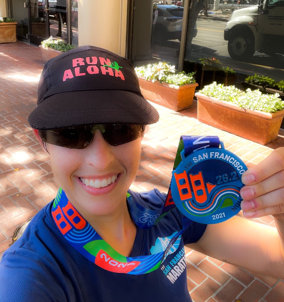 A few weeks ago I ran San Francisco Marathon. SF Marathon is a race that holds a special place in my heart. It was my first ever marathon (if you can believe it!), and one of the few races I’ve won (the ultramarathon distance, which is a much less competitive field). It’s also a course that I know well – I’ve run every inch of it over and over throughout the years. Some stretches – like along the Embarcadero – are ones that I’ve run possibly hundreds of times, and I have many wonderful memories of seeing the sun rise over the Bay Bridge, or watching the fog hover under the Golden Gate Bridge. Other parts of it – like the Presidio Climb – I only do on longer training runs, and other parts of it – like Golden Gate Park – I have done with many friends over the years. It’s such a beautiful course – and one that is very meaningful to me!
