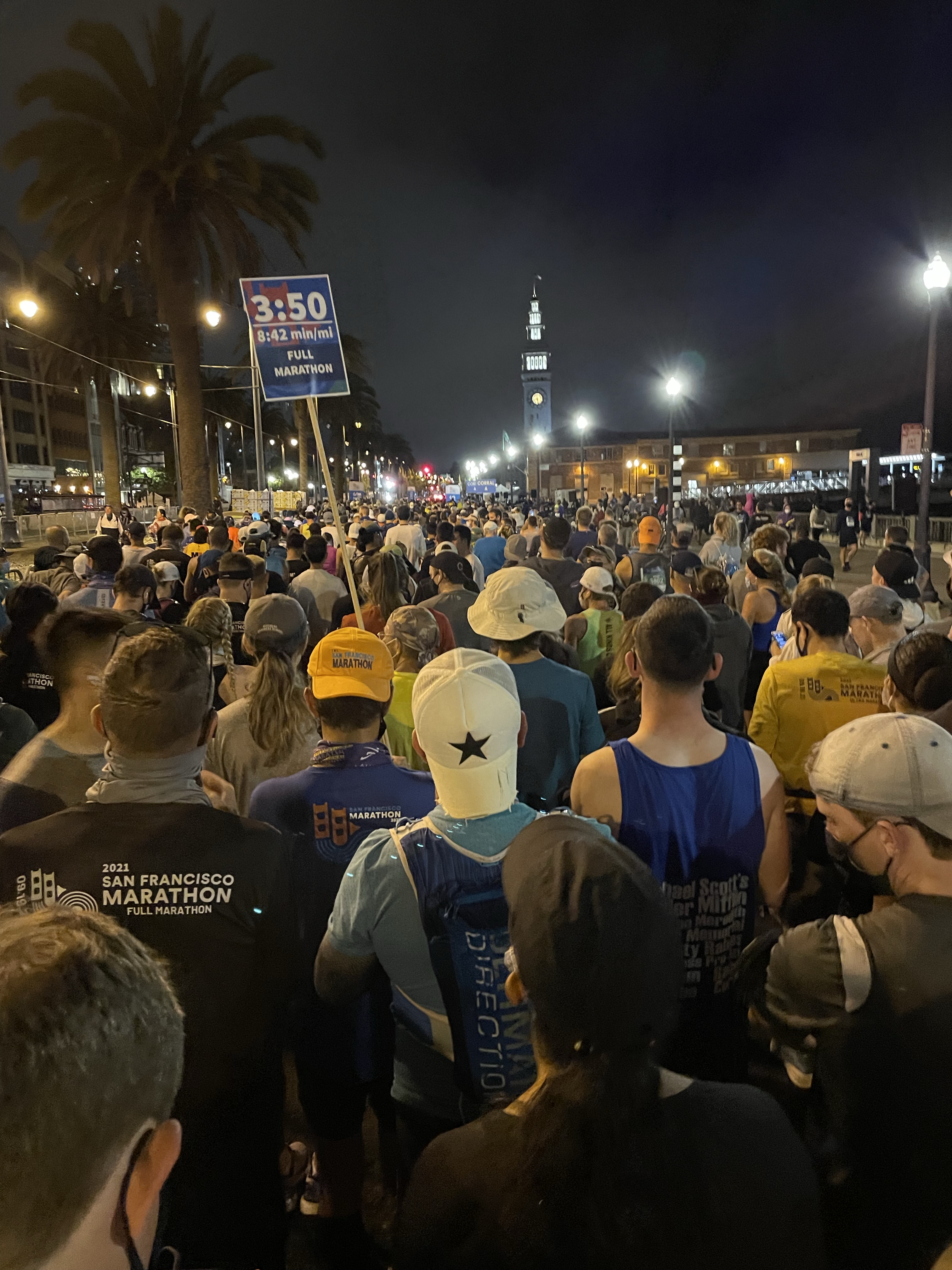 - They let runners start in groups of five at a time, with two (very quickly counted) seconds in between. This sounds, on paper, really irritating, but in practice, I actually loved it. It meant no jockeying for position at the start line, and no dodging other runners for the first few miles