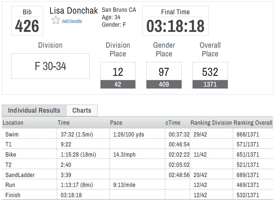 My time in the water was 37:32, which was actually not long at all, because the tide was on the way out and helping push us along quite a bit. I was pleasantly surprised. This put me at 29th out of 42 women in my age group, which isn’t great. However, I was so relieved to have made the cutoff that I didn’t even care.