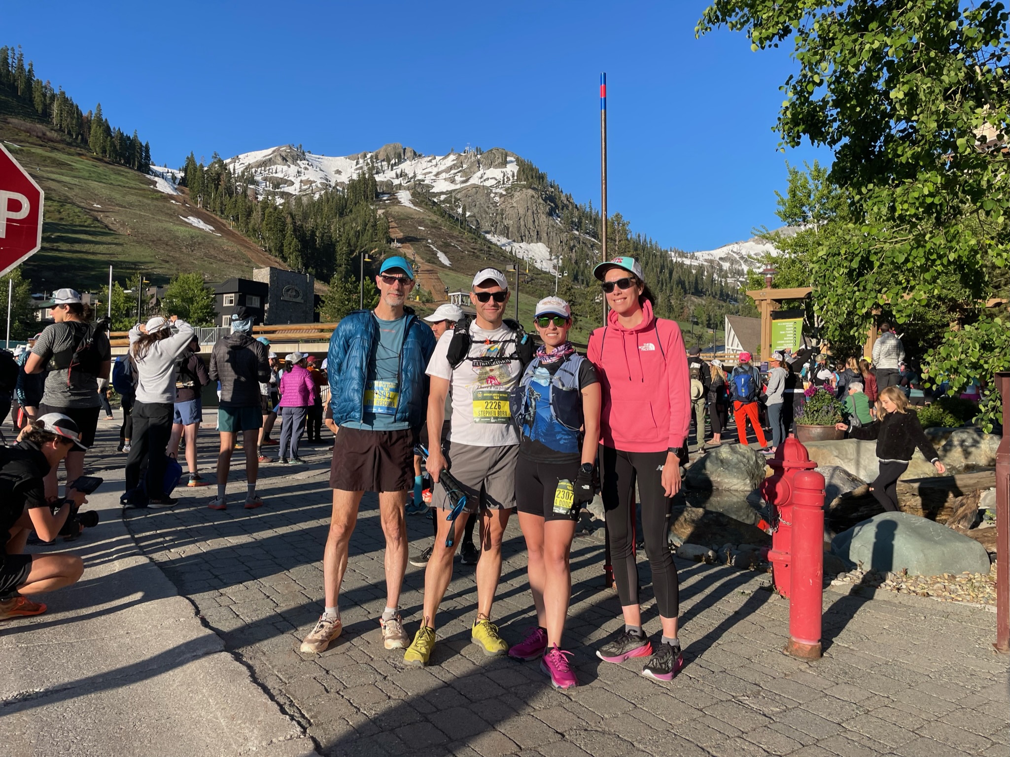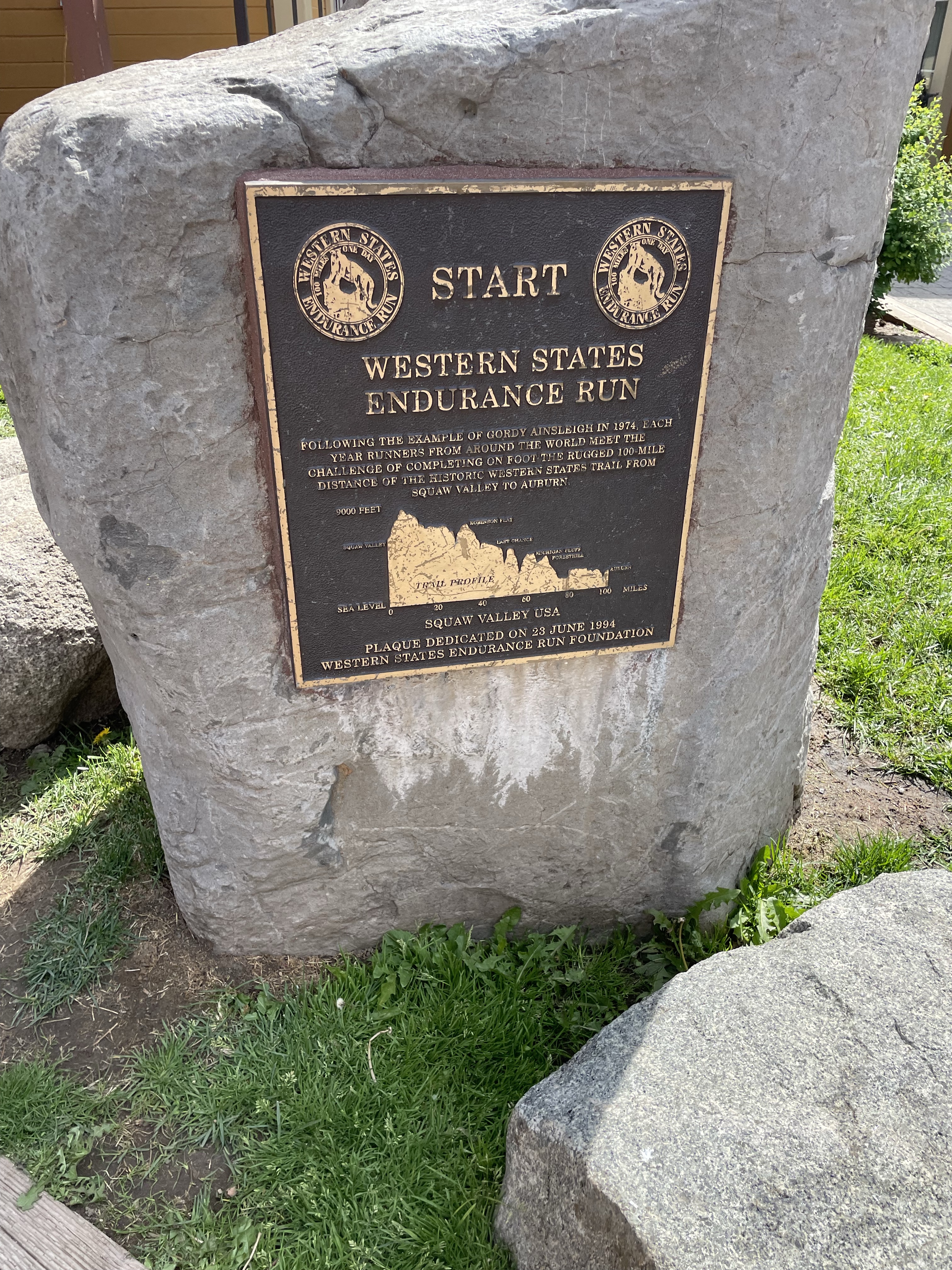 I wasn’t feeling great after the race – was pretty tired, my lungs were overworked, and my stomach was a little unsettled. I found a patch of grass to lay down behind – right behind the Western States start plaque, so that was kind of neat. We all eventually headed back to the cabin, cleaned up, and got food.