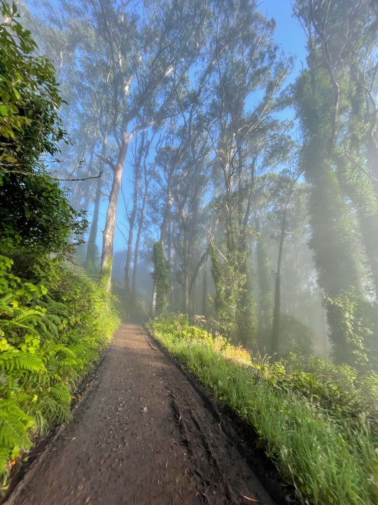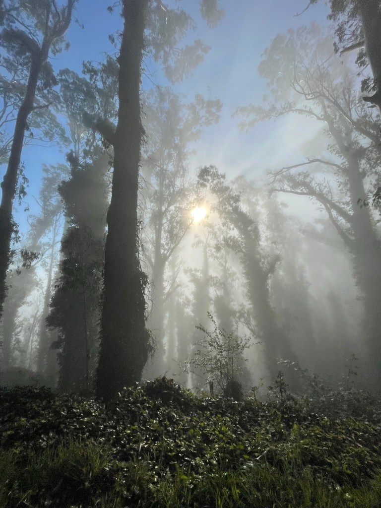 - Gorgeous cloud forest of eucalyptus trees in the fog, with sun rays coming through (see pictures below)