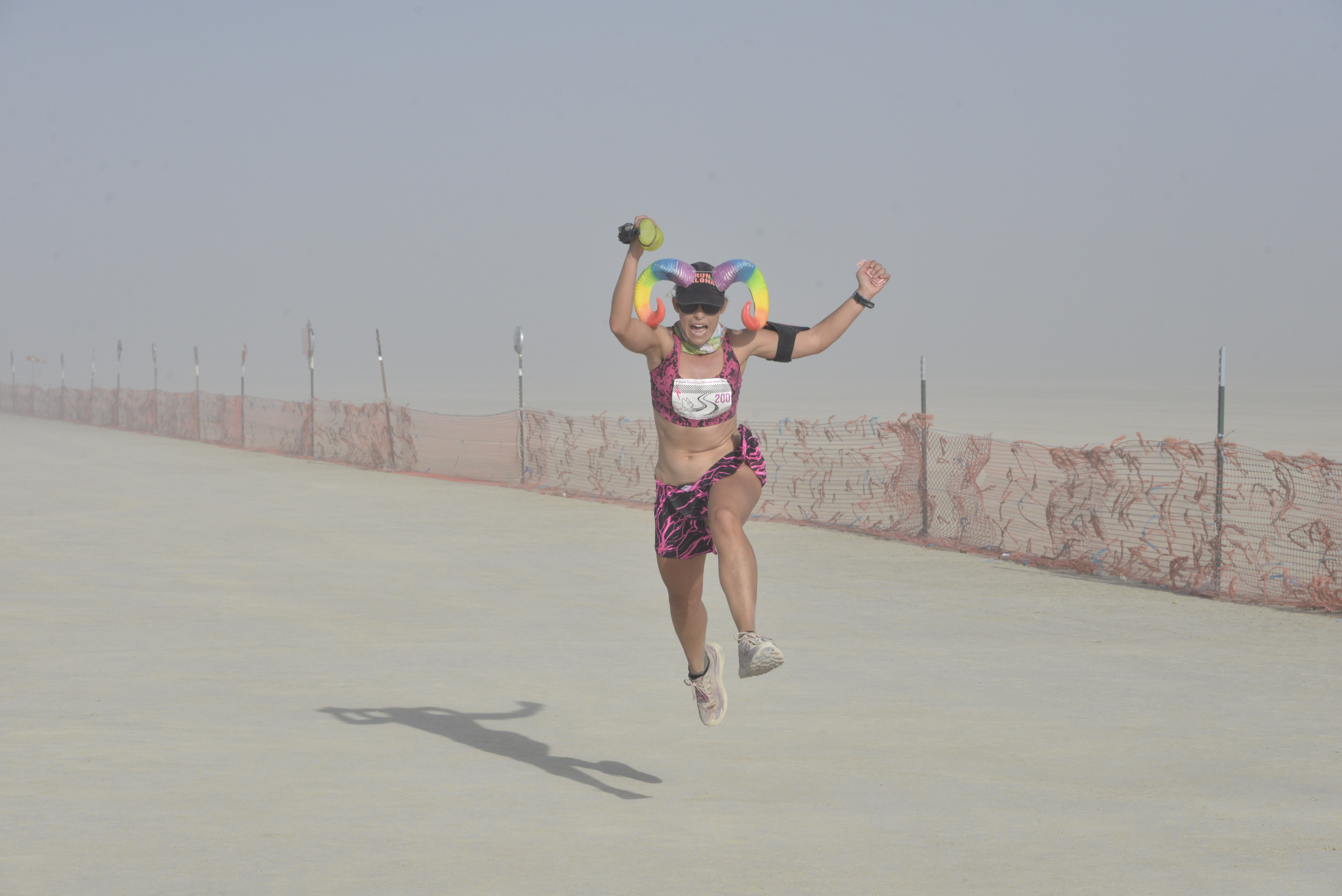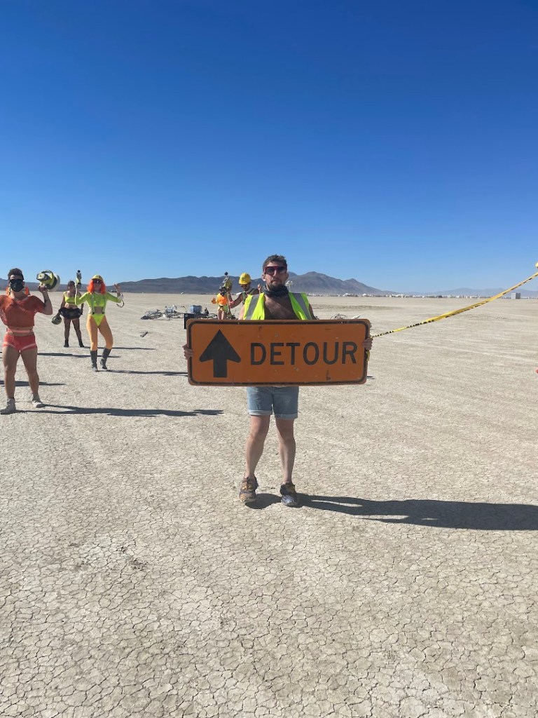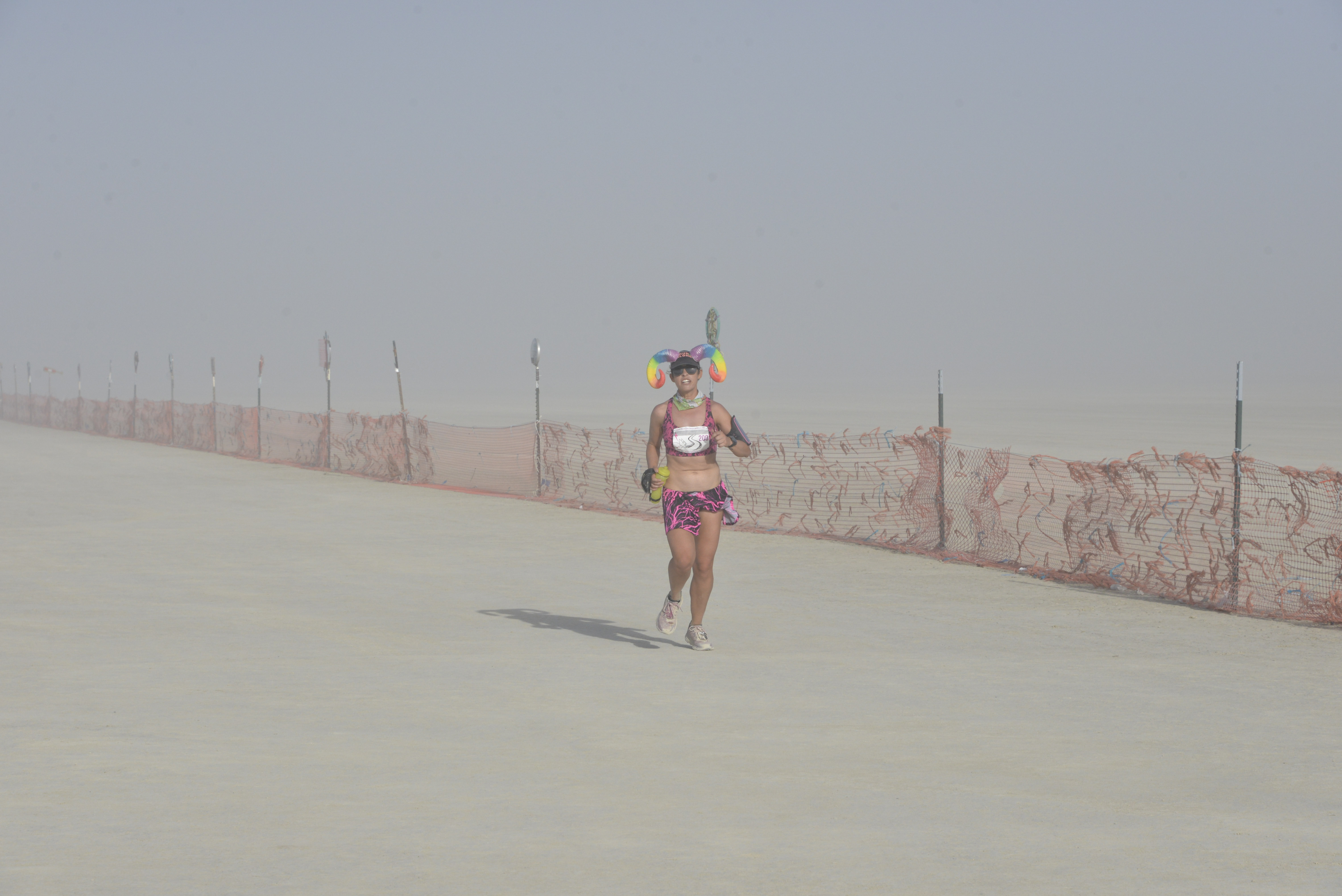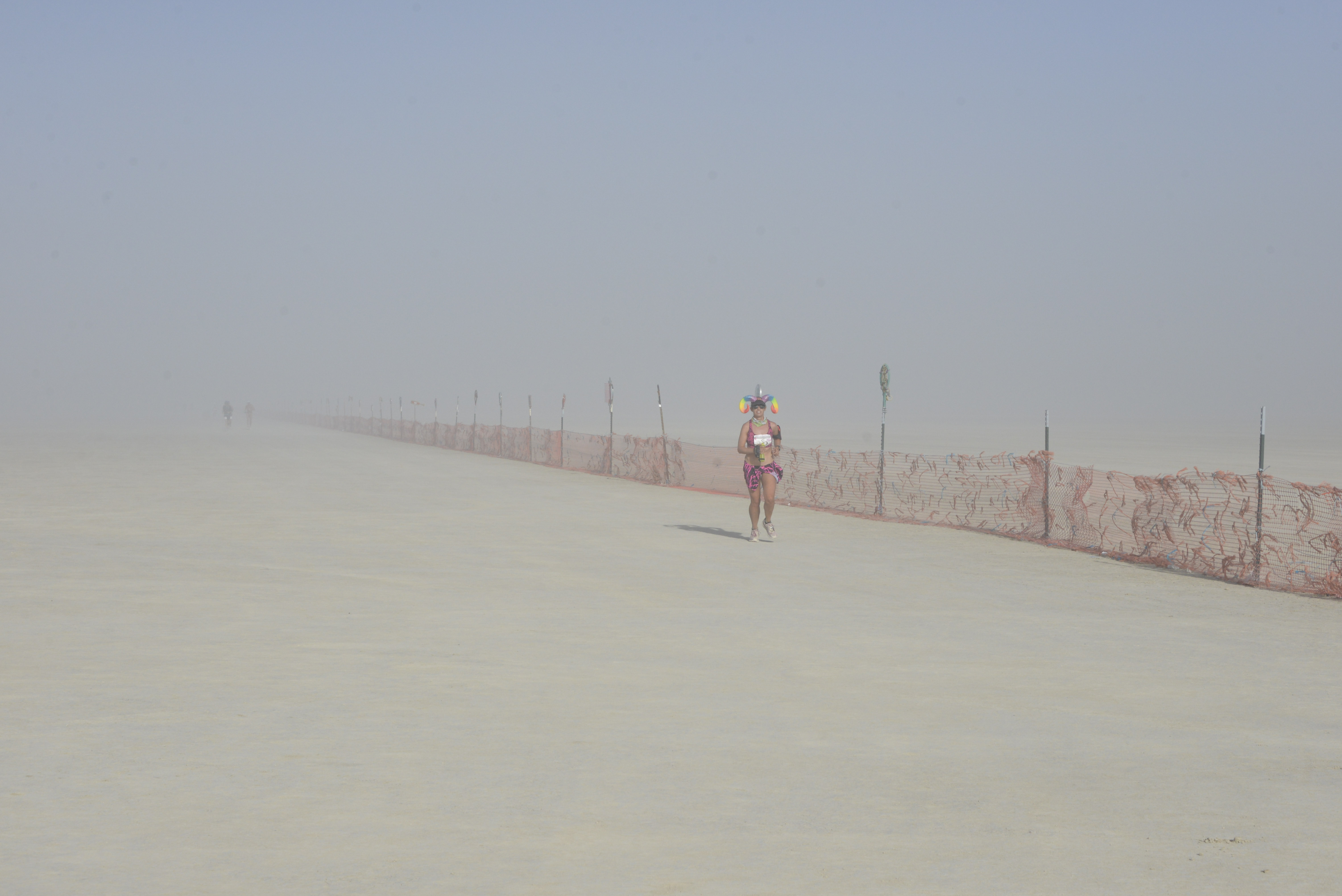 The race was approximately as hard as usual. I finished in 5:38, which is about half an hour faster than last year (when I was injured), but not even close to my PR on the course. I took a couple of detours (see below), ran with friends, and generally had a good time. This year probably had the worst whiteout / dust conditions of any year that I’ve run it. There were times where we could not see ten feet ahead, and I had to use echolocation (e.g. make loud noises) to prevent burners on bicycles from running into me.