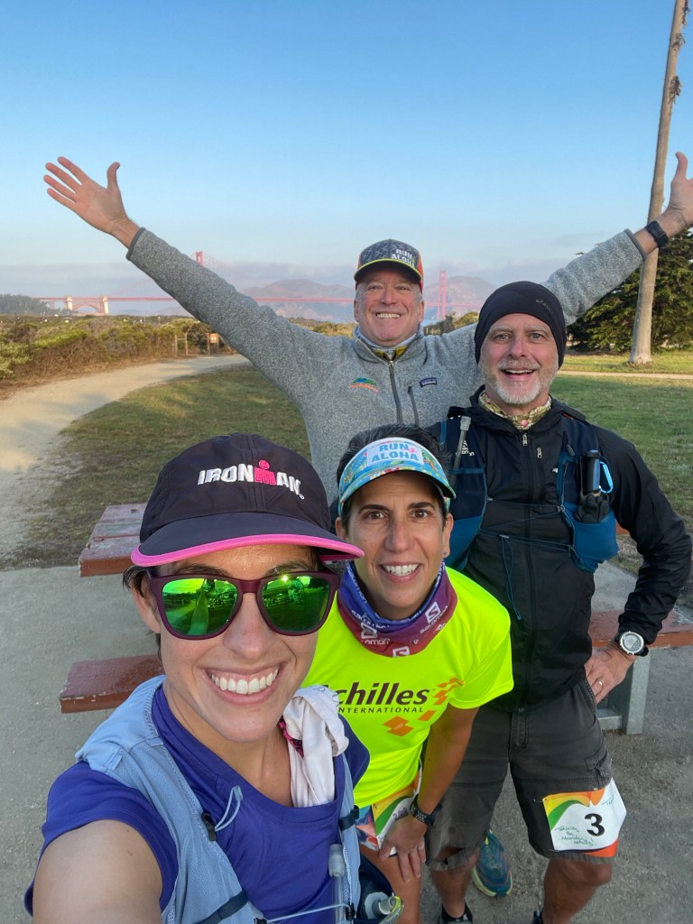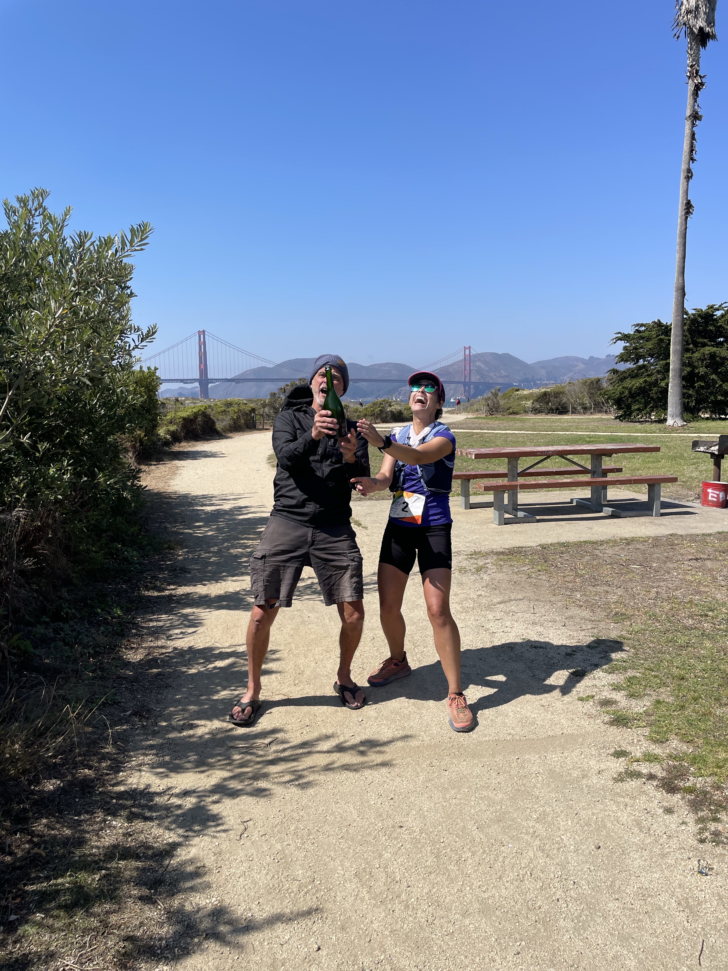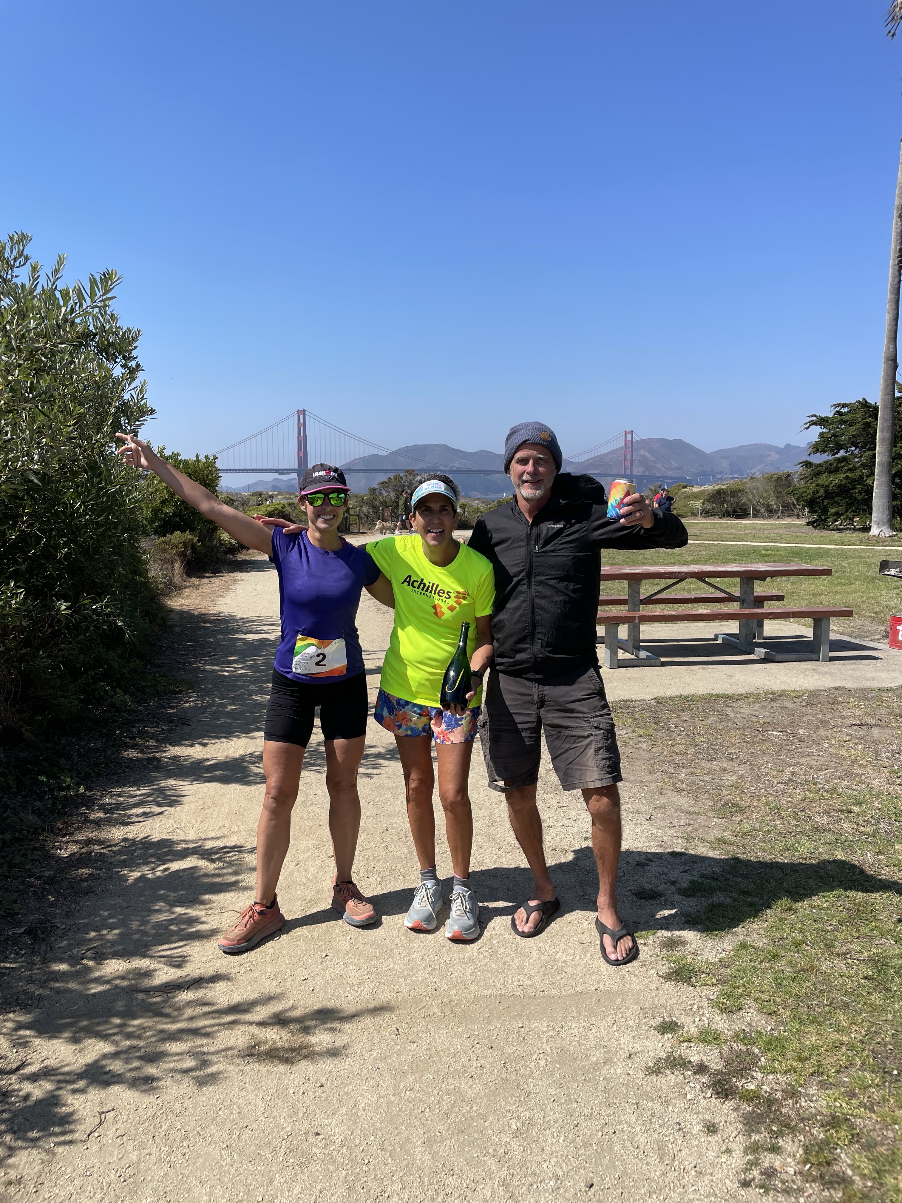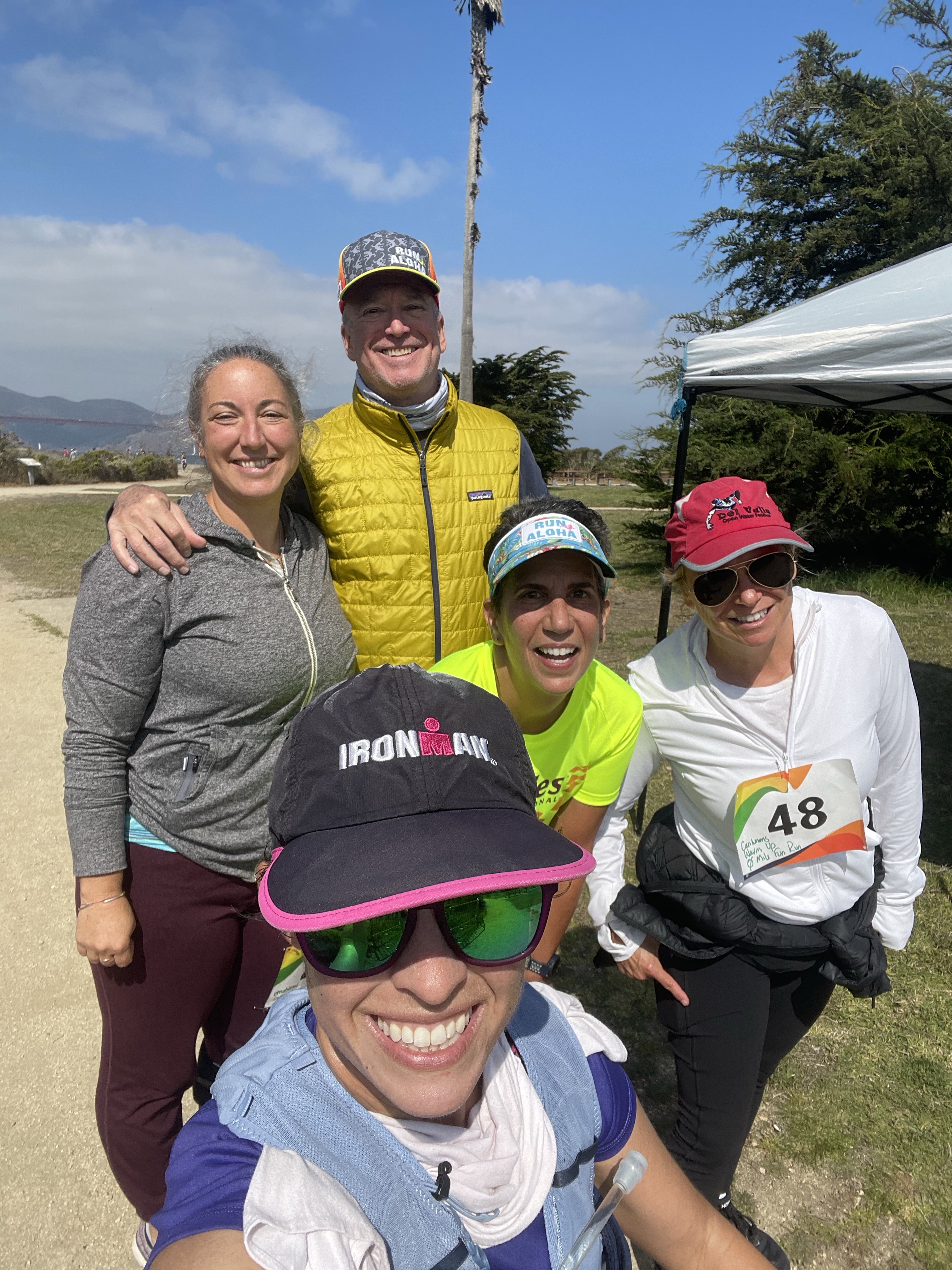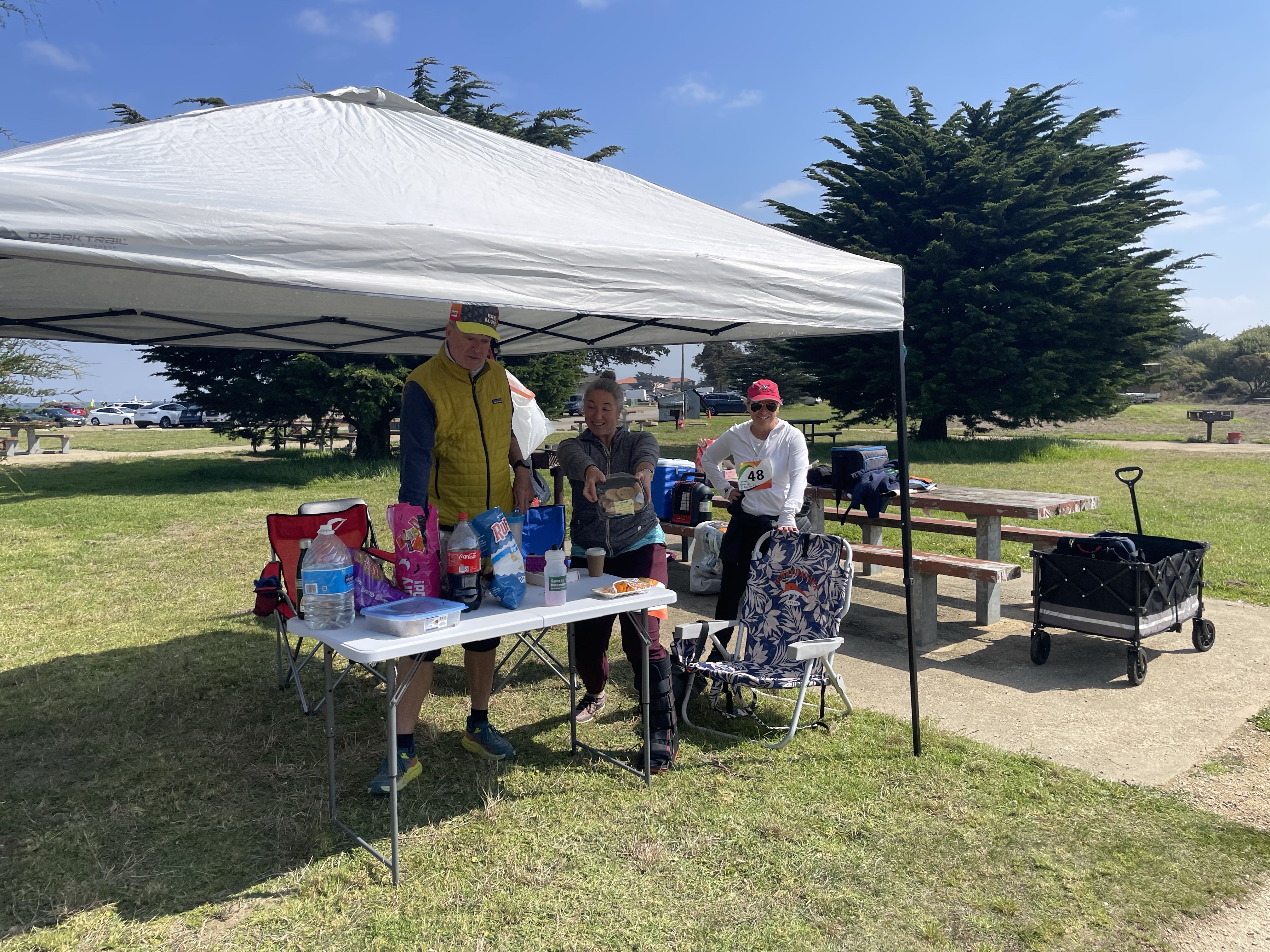 Our mini event took place at Crissy Field, and the goal was to run as many one-mile laps as you wanted to run around the lagoon that is there. Susan and I were running, along with Tracy – our only male competitor! We had support from Crew Captain Patrick (see below for our super legit aid station), and many friends from swimming stopped by, including Ana, Jean, and Mary, for crewing and pacing. We had self-decorated bibs, which was fun because a few people stopped to ask what race we were running. A couple of folks cheered for Tracy when they saw him on the Golden Gate Bridge (he took a detour, which is definitely allowed in this race)