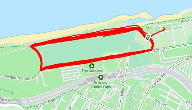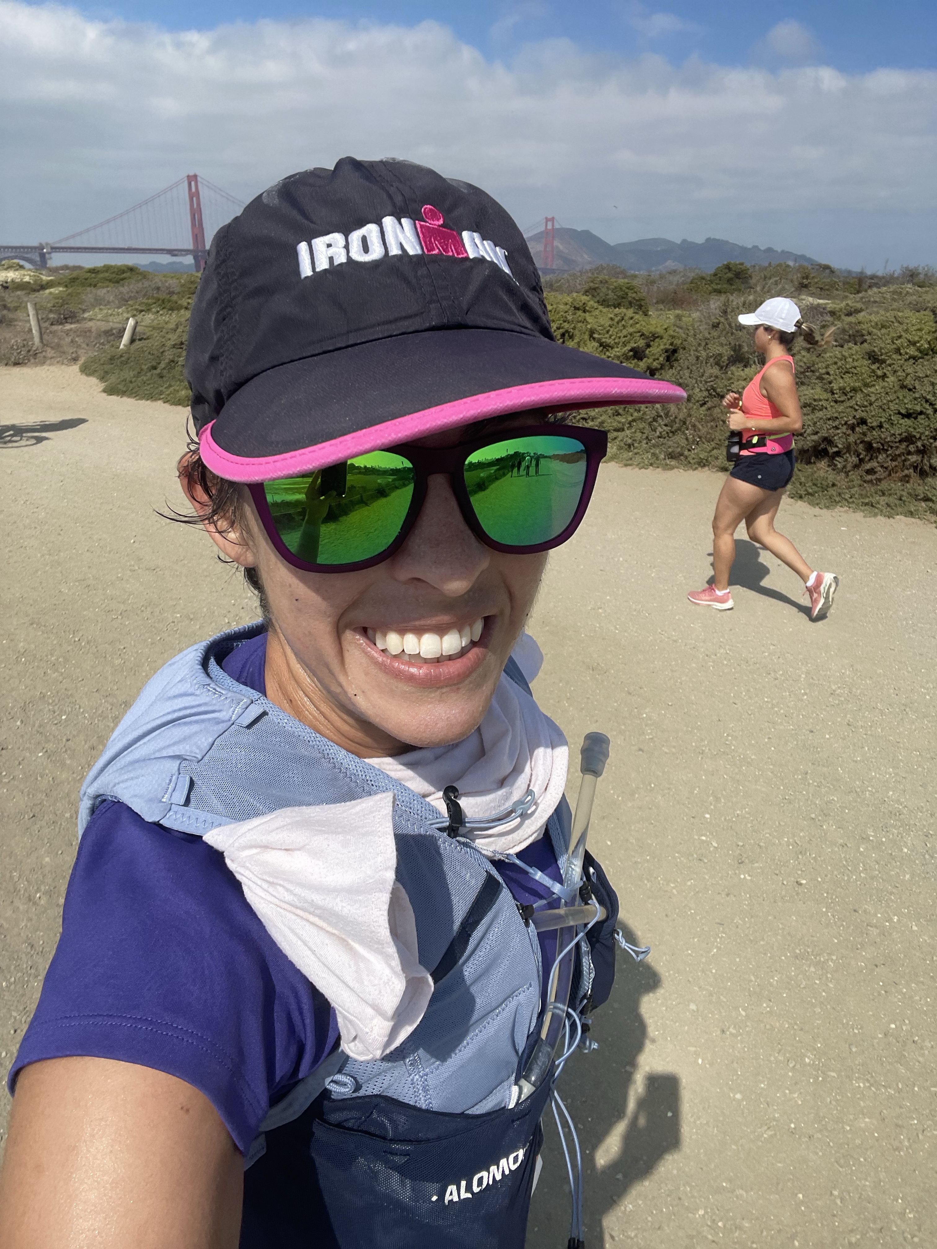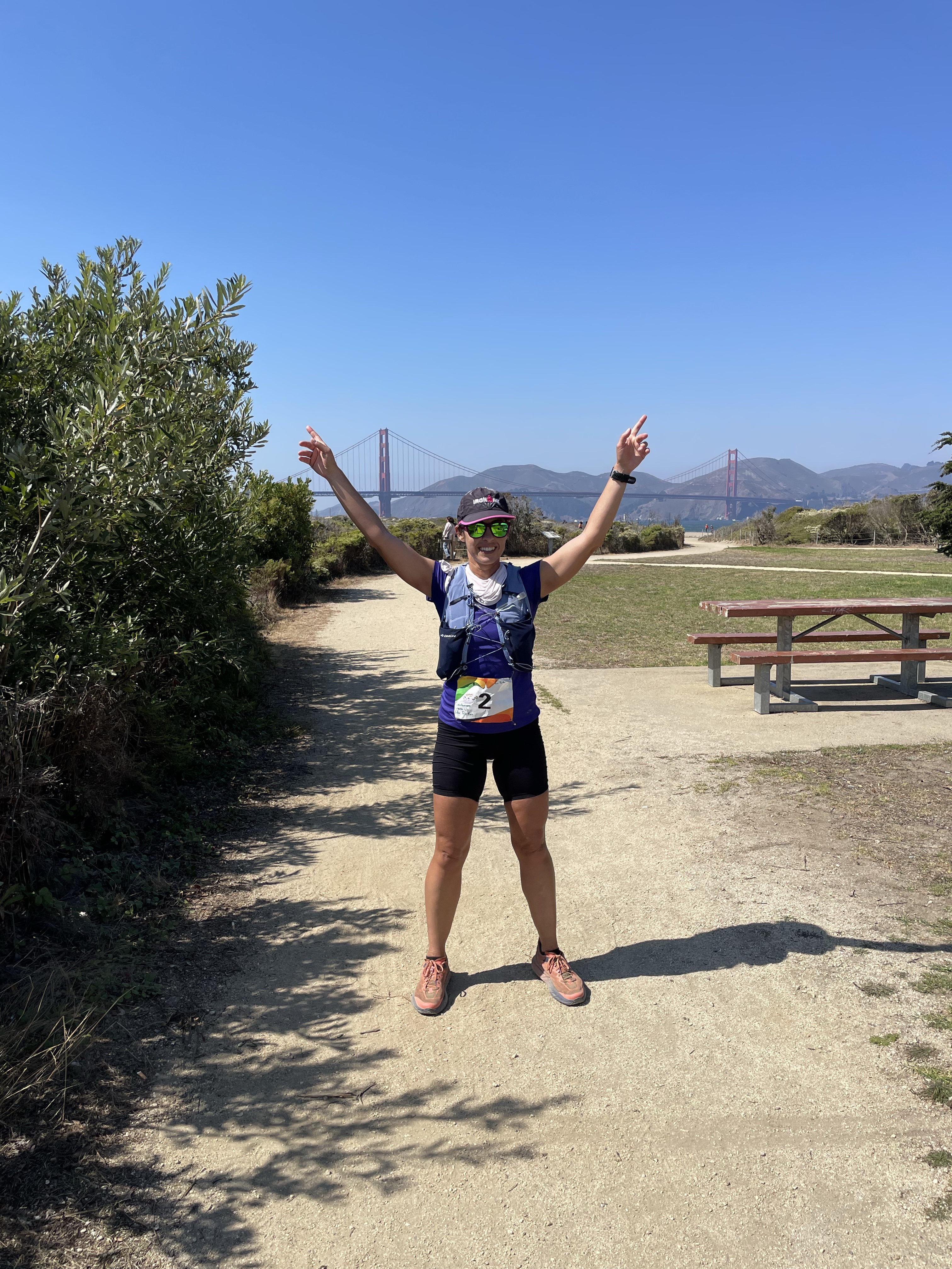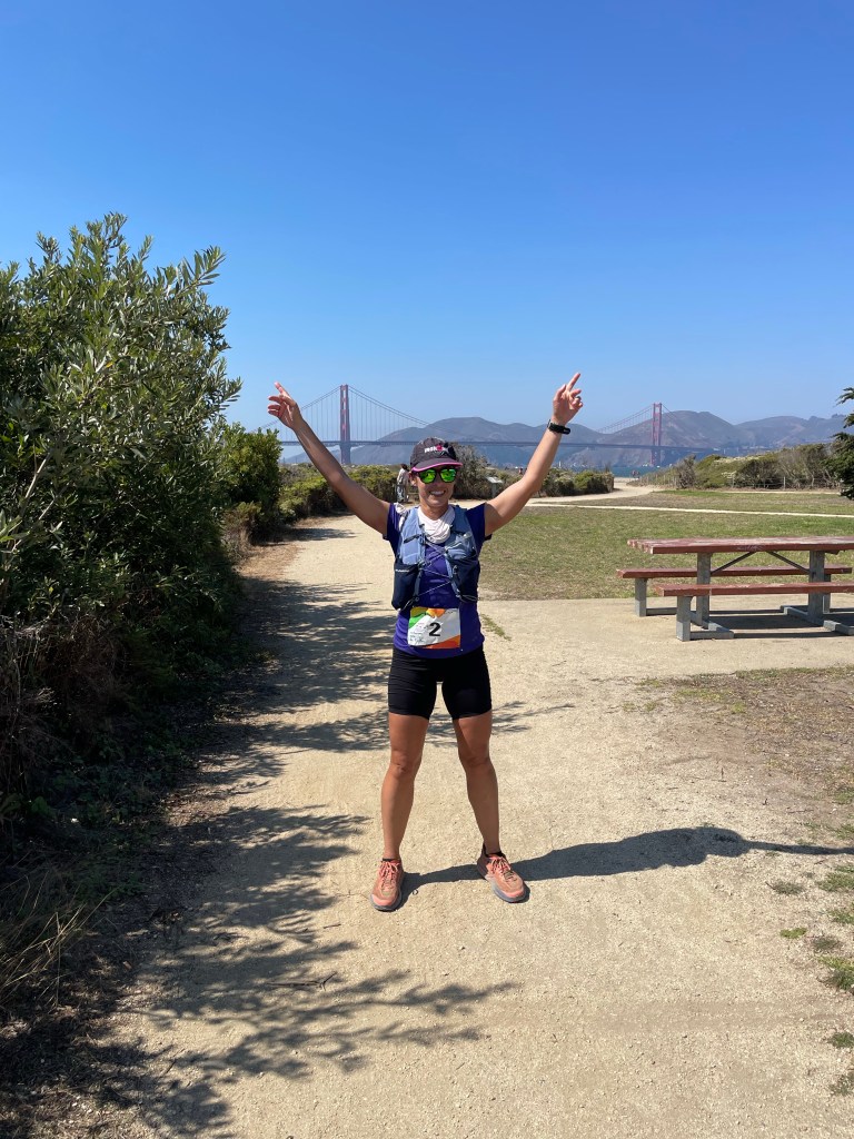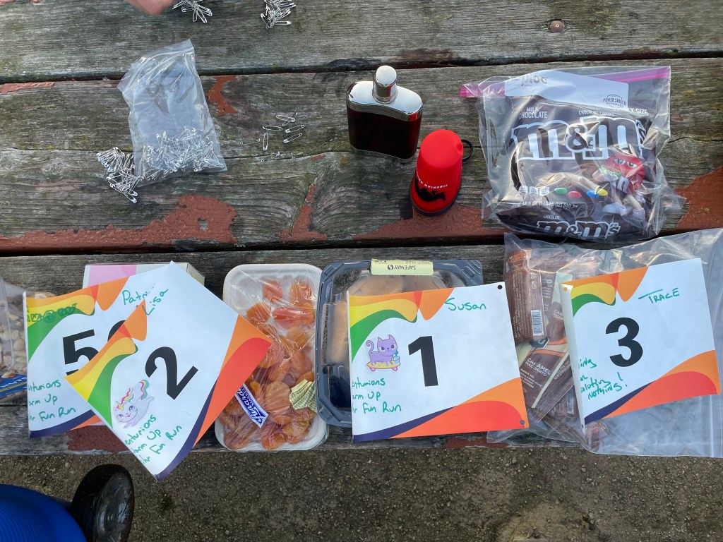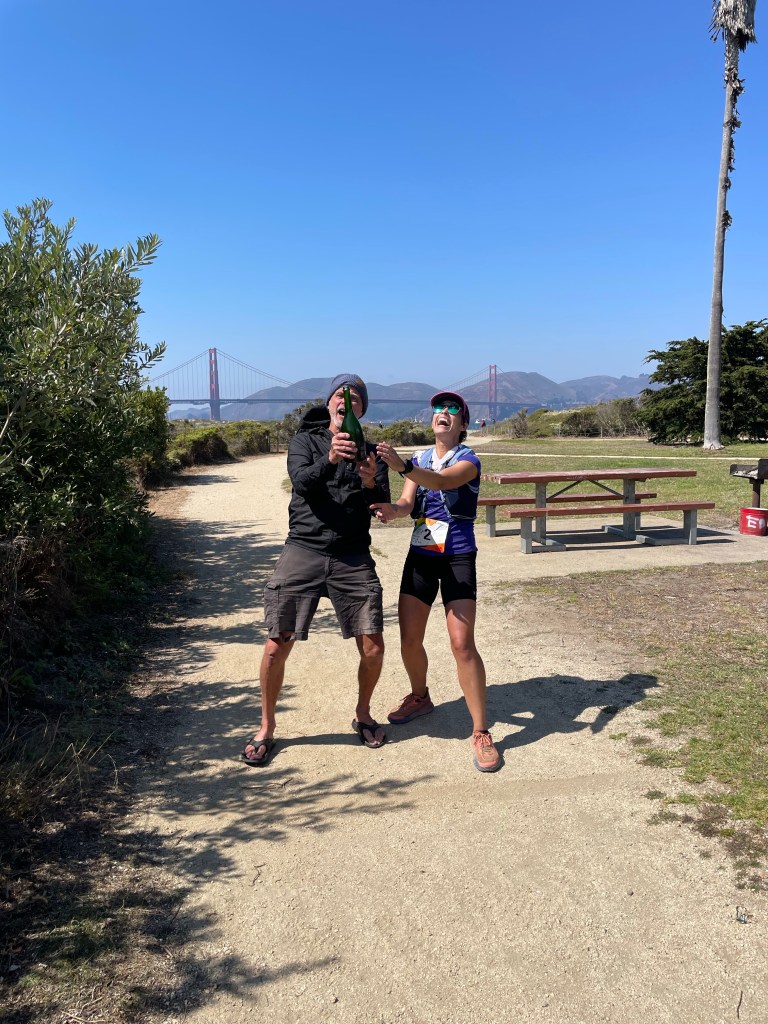 Our mini event took place at Crissy Field, and the goal was to run as many one-mile laps as you wanted to run around the lagoon that is there. Susan and I were running, along with Tracy – our only male competitor! We had support from Crew Captain Patrick (see below for our super legit aid station), and many friends from swimming stopped by, including Ana, Jean, and Mary, for crewing and pacing. We had self-decorated bibs, which was fun because a few people stopped to ask what race we were running. A couple of folks cheered for Tracy when they saw him on the Golden Gate Bridge (he took a detour, which is definitely allowed in this race)