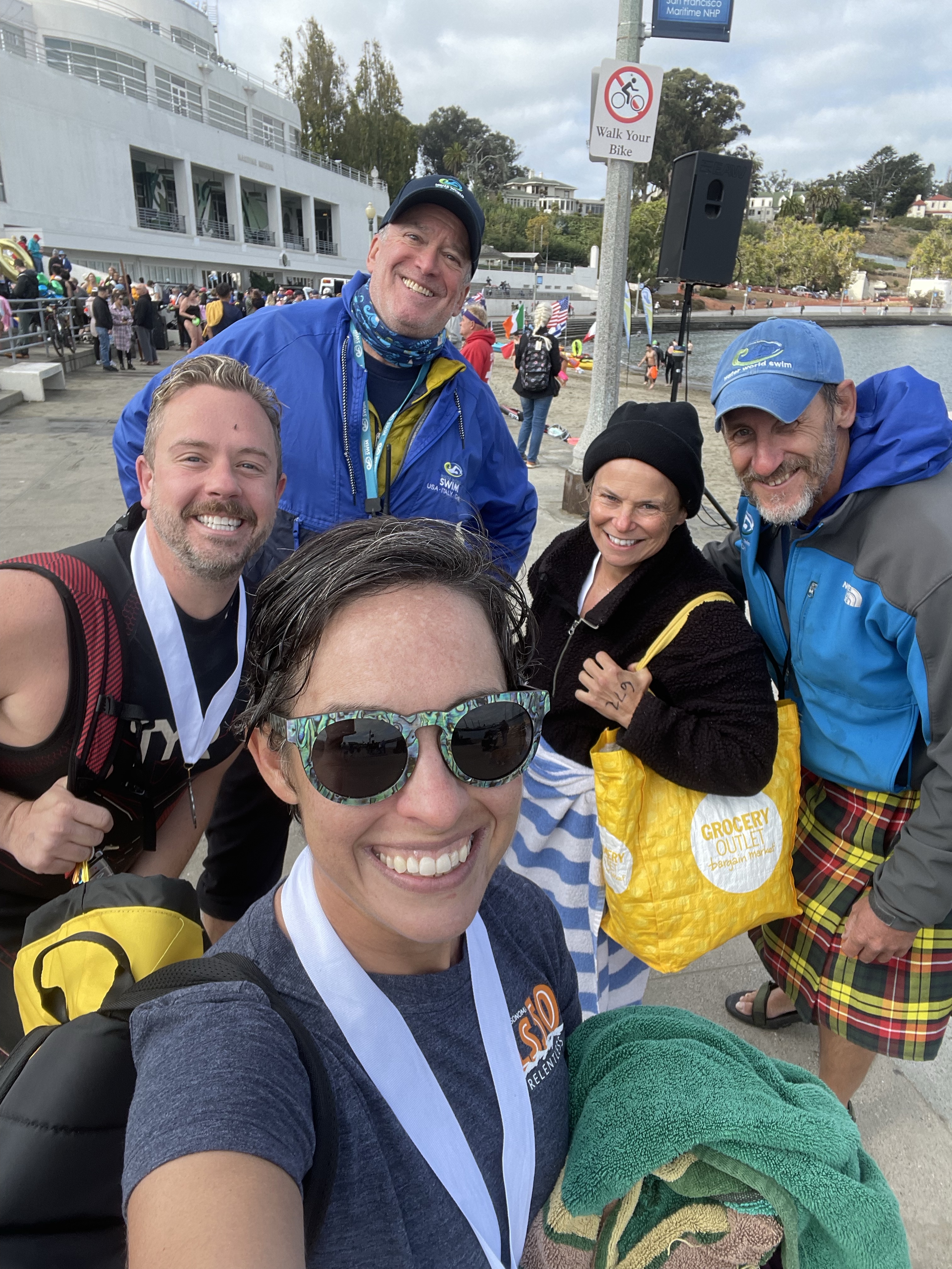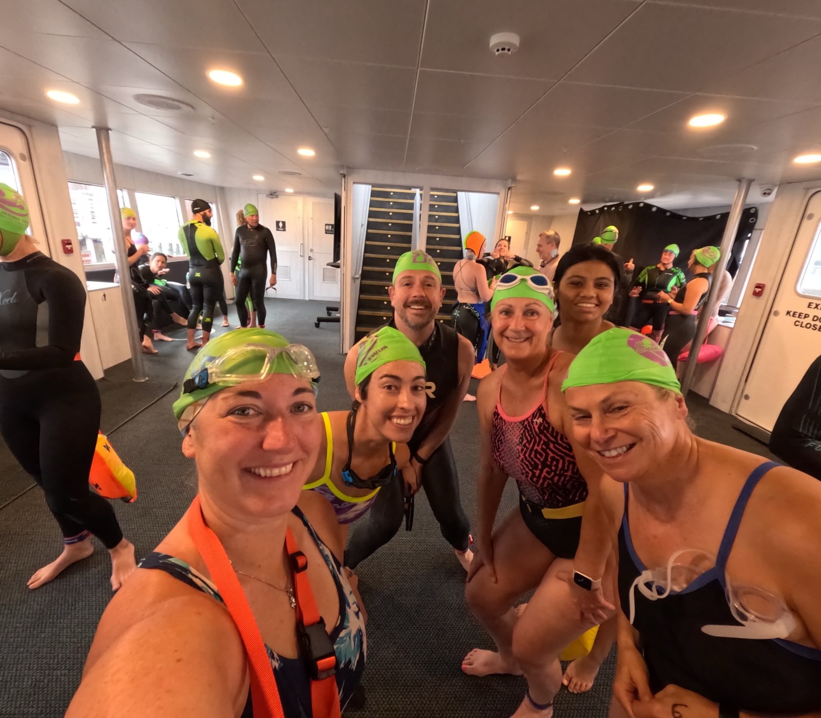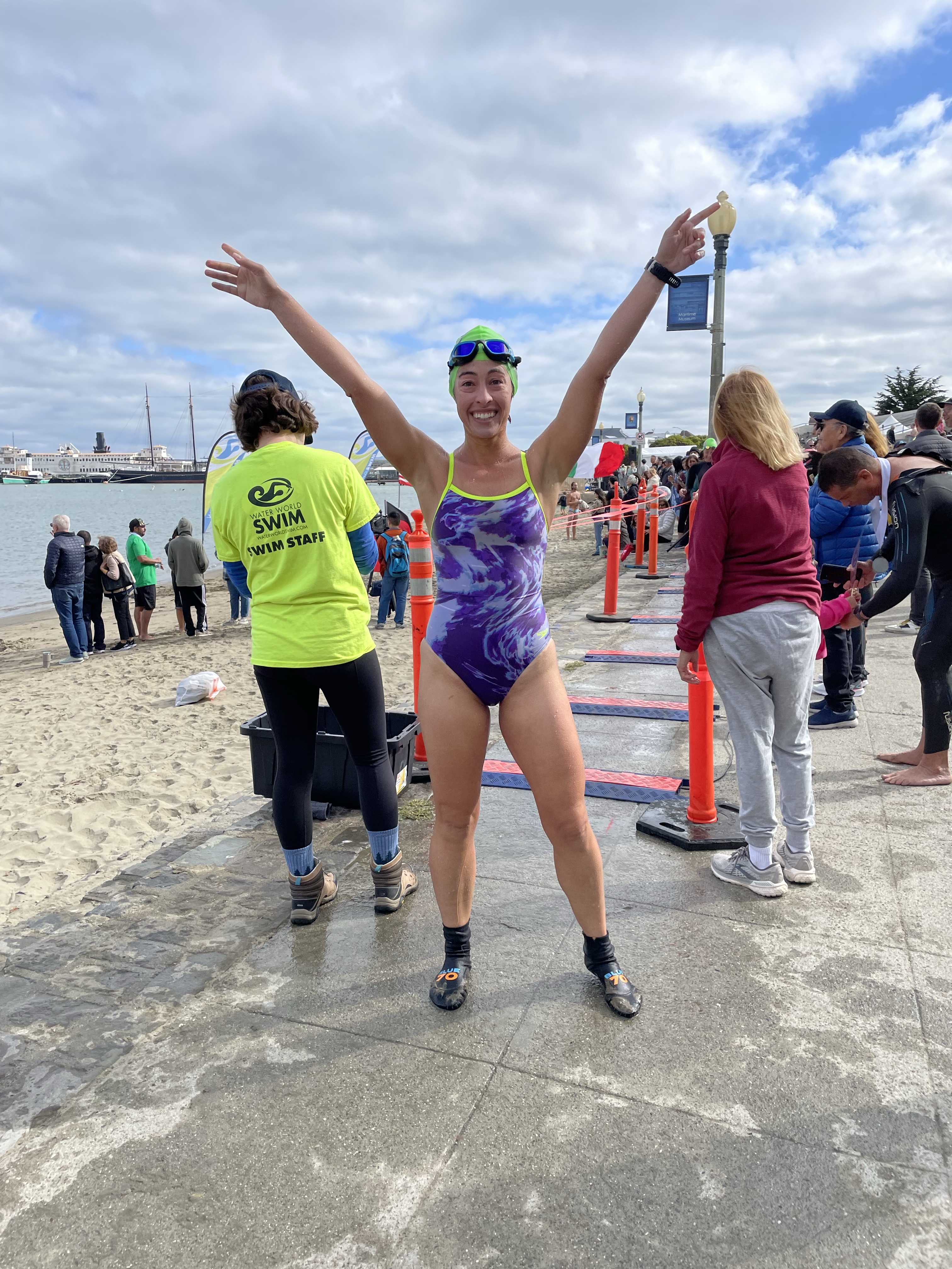 This was arguably my first Alcatraz crossing (for the Escape from Alcatraz Triathlon, they brought us a little closer to shore due to fog) – and it was really fun! You can see that our crew are mostly crazy people who swim without wetsuits, but the water was really warm so it was a good day to give that a try. I had been training without a wetsuit for several months, so I was ready and did not freeze during the crossing!
