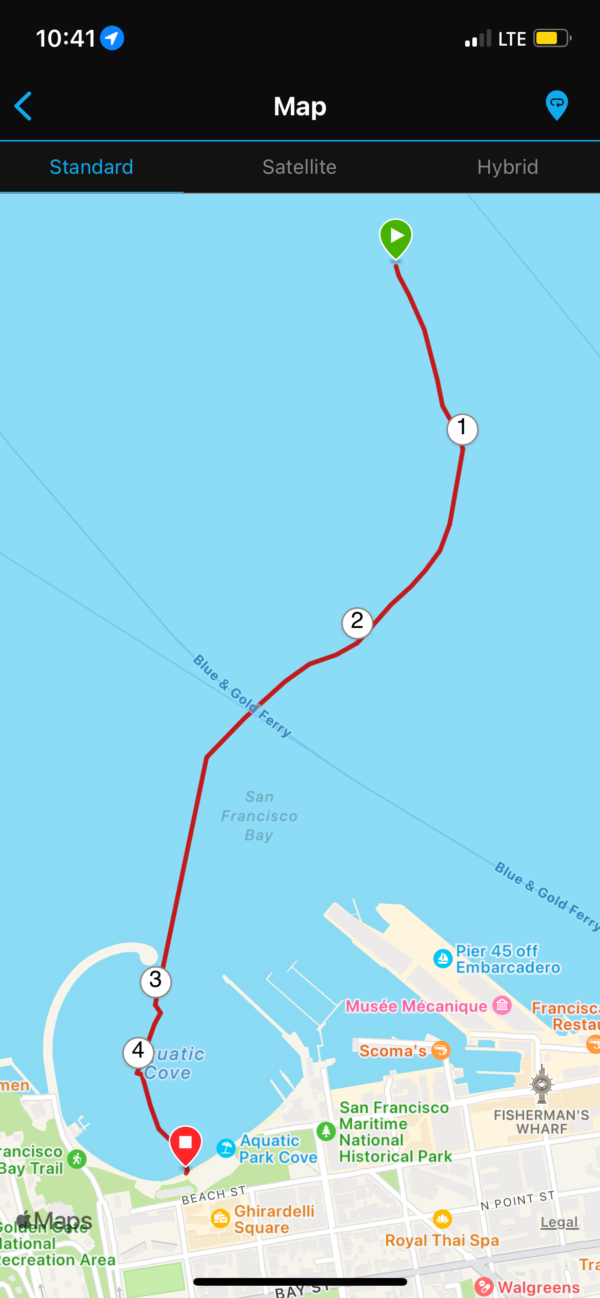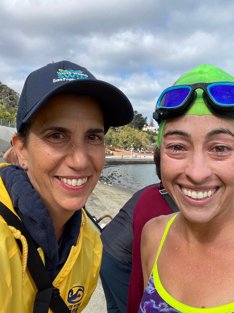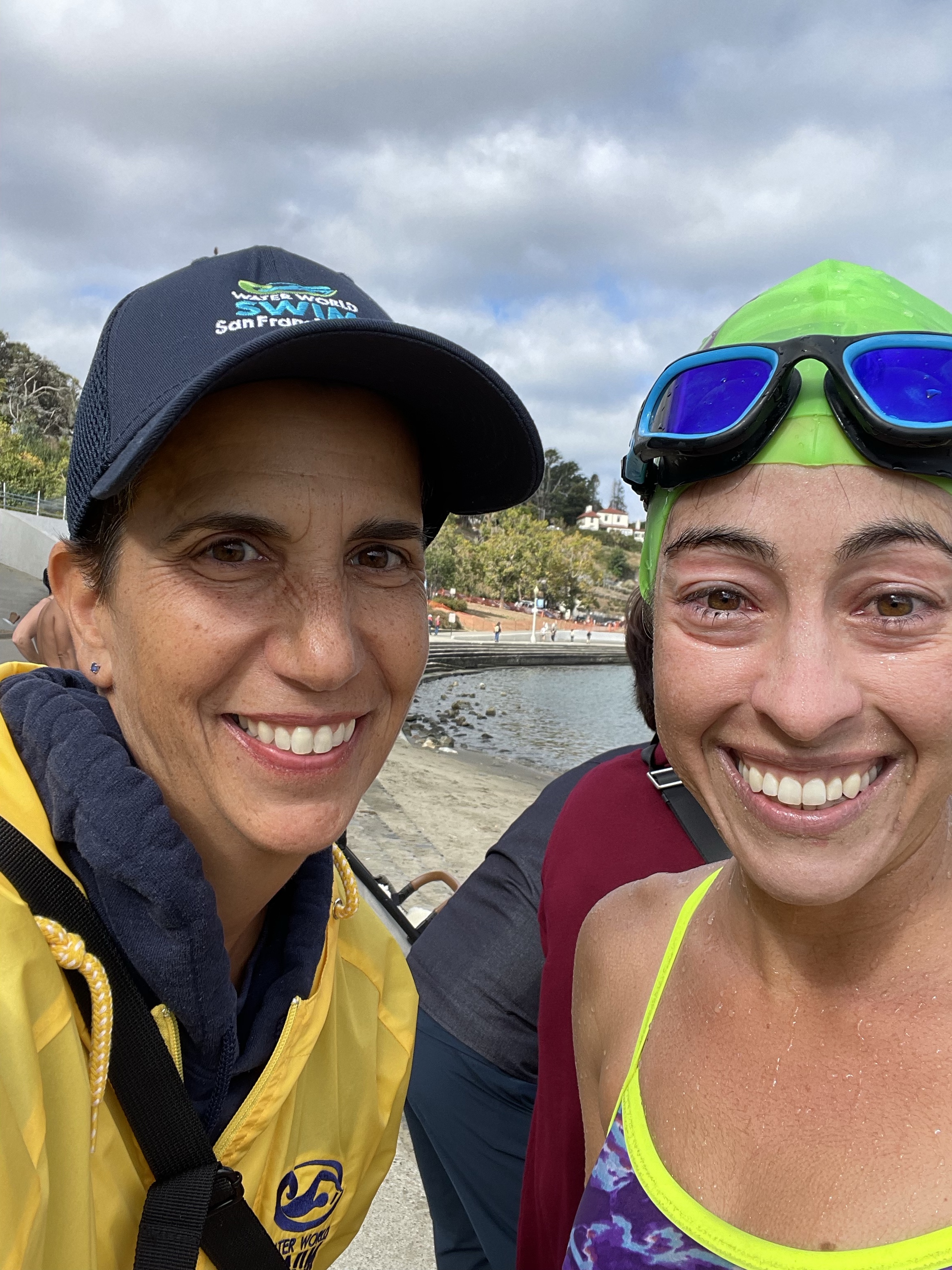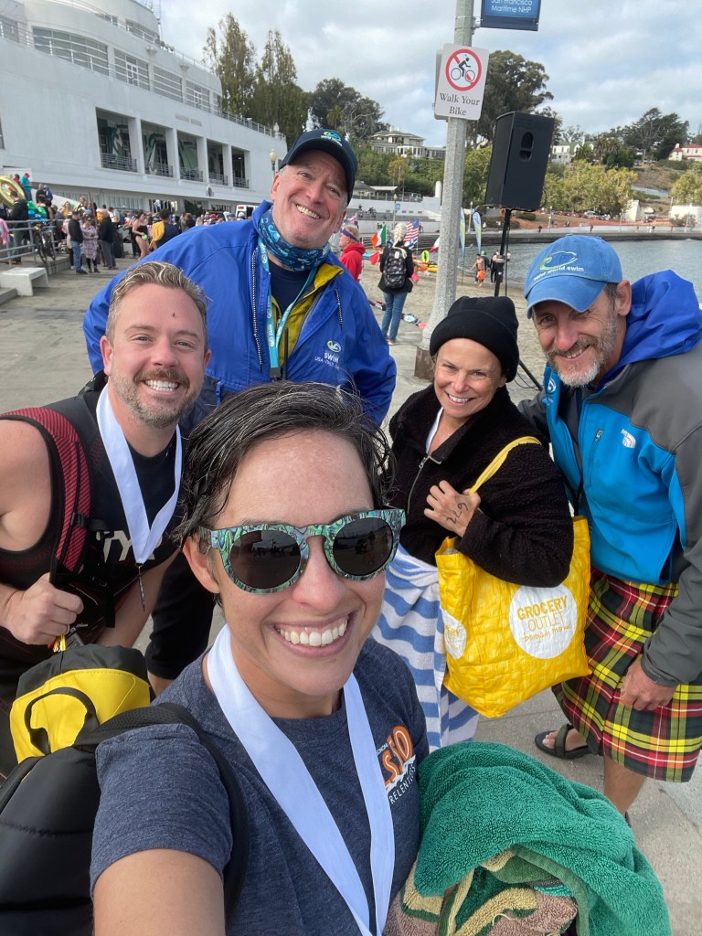 This was arguably my first Alcatraz crossing (for the Escape from Alcatraz Triathlon, they brought us a little closer to shore due to fog) – and it was really fun! You can see that our crew are mostly crazy people who swim without wetsuits, but the water was really warm so it was a good day to give that a try. I had been training without a wetsuit for several months, so I was ready and did not freeze during the crossing!