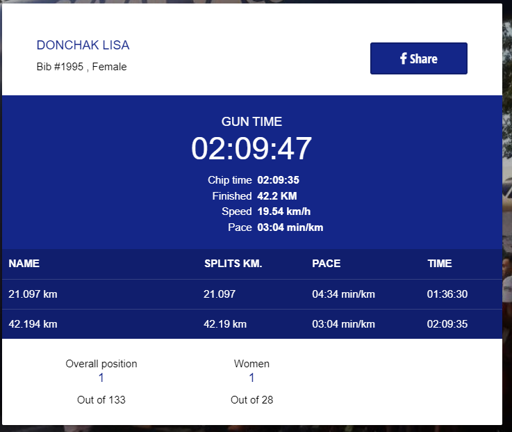 - Edit two weeks later: They updated the website and apparently I have now run the whole race in 2:09:47, which is not only good enough to win overall (for both men and women), but also a world record time (womens current WR is 2:11). See you at the Olympics.