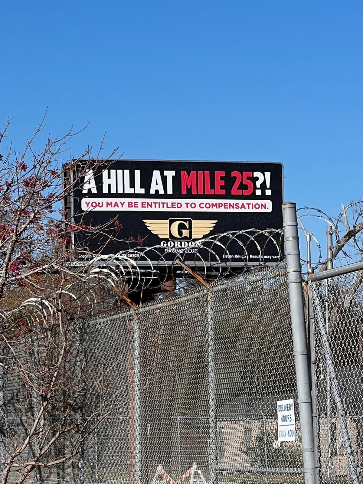 Around mile 20/21, Erin wanted to pick up the pace a bit, so we sped up. I was able to keep up with her for about a mile or so before falling back. The last few miles were a push for me, but I mostly maintained my pace and stayed ahead of the 4:00 group. There were a couple of rolling hills that slowed me down a bit. The best part of this section was the legal advertisement billboard at mile 25: “A hill at mile 25?! You may be entitled to compensation.”