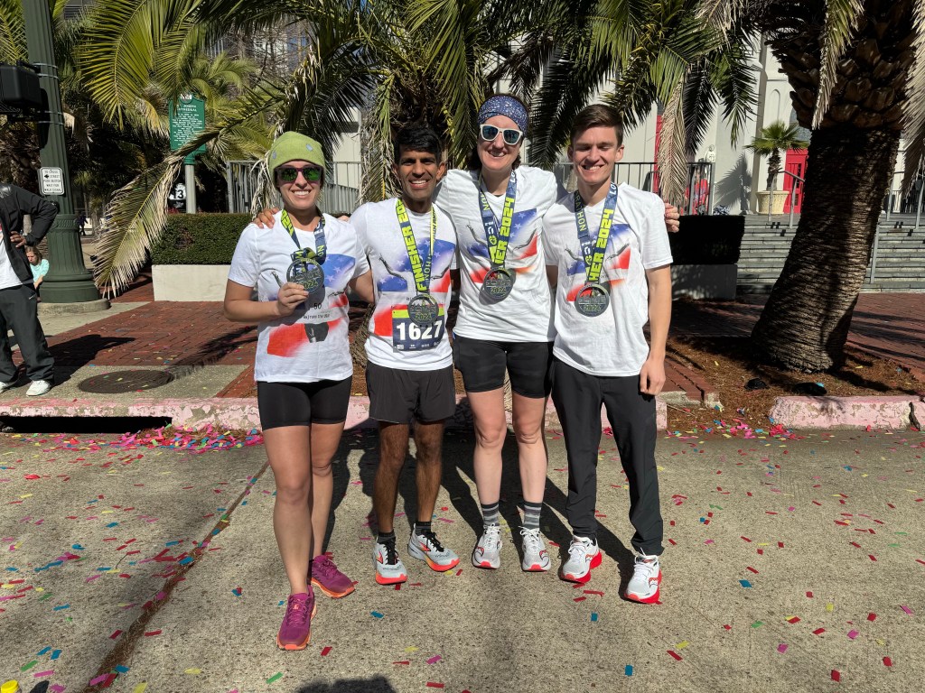 A lot of the group were standing about two blocks from the finish line, so I saw most of them before finishing – just a minute or two behind Erin. We got some snacks at the finish line village. One of the tents was serving gumbo or jambalaya or something, and it was incredible. After taking our own picture, we walked back over to where the big group was and took a post-race picture with the whole group.